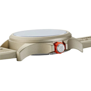 Mostrador com acabamento jateado, disponível nas versões marrom (XB.3716) ou sand (XB.3717), com logo Luminox em relevo e numeração 12h e 24h contrastante.